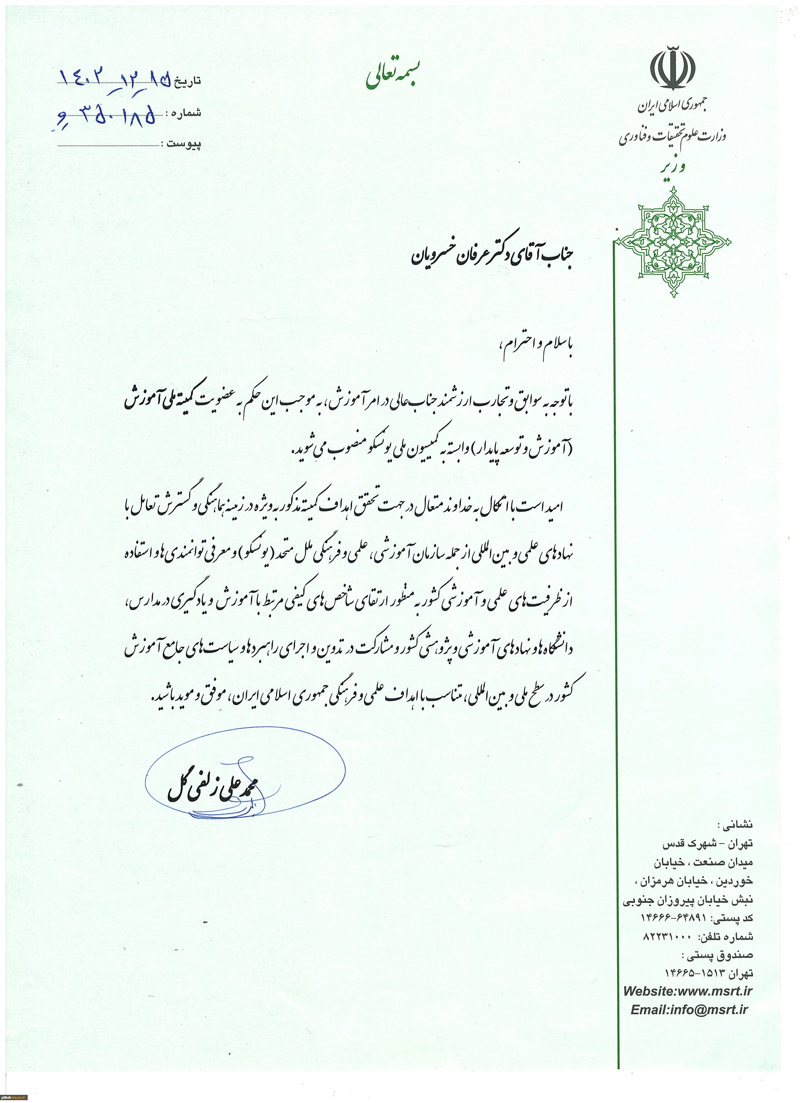 امتیاز دهید : با حکم وزیر علوم، تحقیقات و فناوری؛ رئیس دانشگاه فنی و حرفهای به عضویت کمیته ملی آموزش، وابسته به کمیسیون ملی یونسکو منصوب شد 2 چهارشنبه 26 اردیبهشت 1403 ساعت 12:08