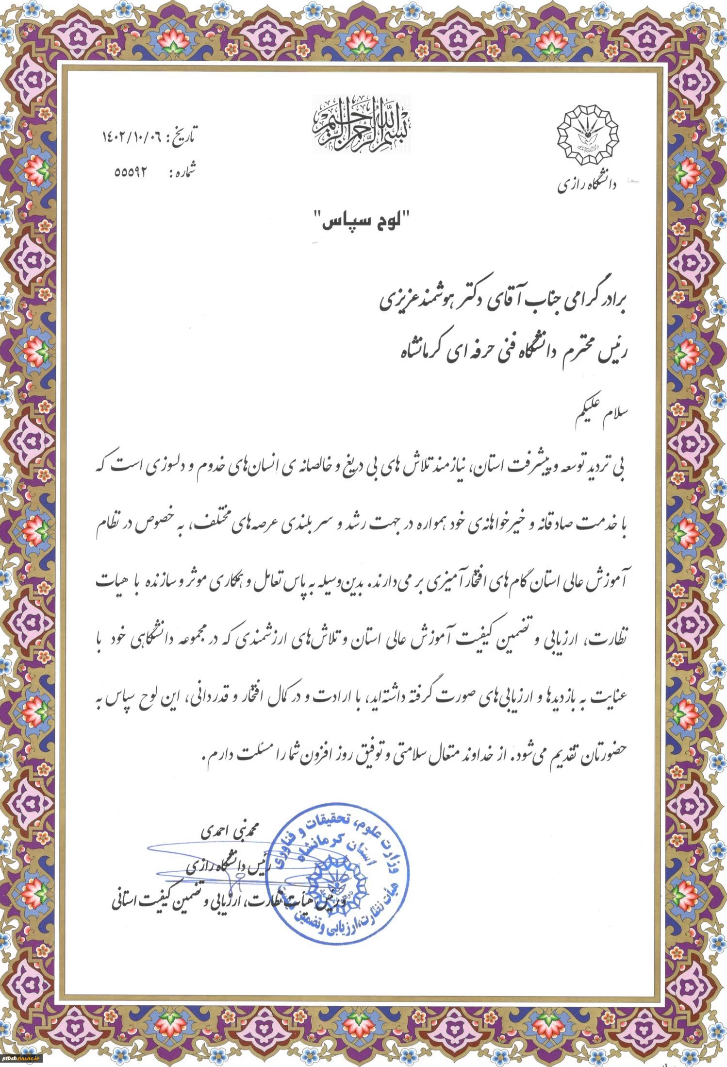 امتیاز دهید : اهدای لوح سپاس ریاست دانشگاه رازی، به ریاست دانشگاه فنی و حرفه ای واحد استان کرمانشاه 2 شنبه 26 خرداد 1403 ساعت 13:11