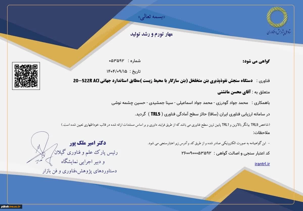 امتیاز دهید : کسب افتخاری دیگر توسط اساتید و دانشجویان دانشگاه ملی مهارت استان کرمانشاه: طراحی و ساخت «دستگاه سنجش نفوذپذیری بتن متخلخل» موفق به کسب سطح آمادگی فناوری (TRL5) در تراز جهانی شد 2 شنبه 15 آذر 1404 ساعت 11:21